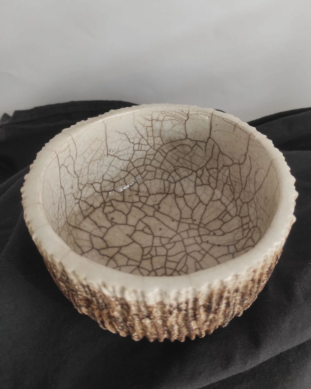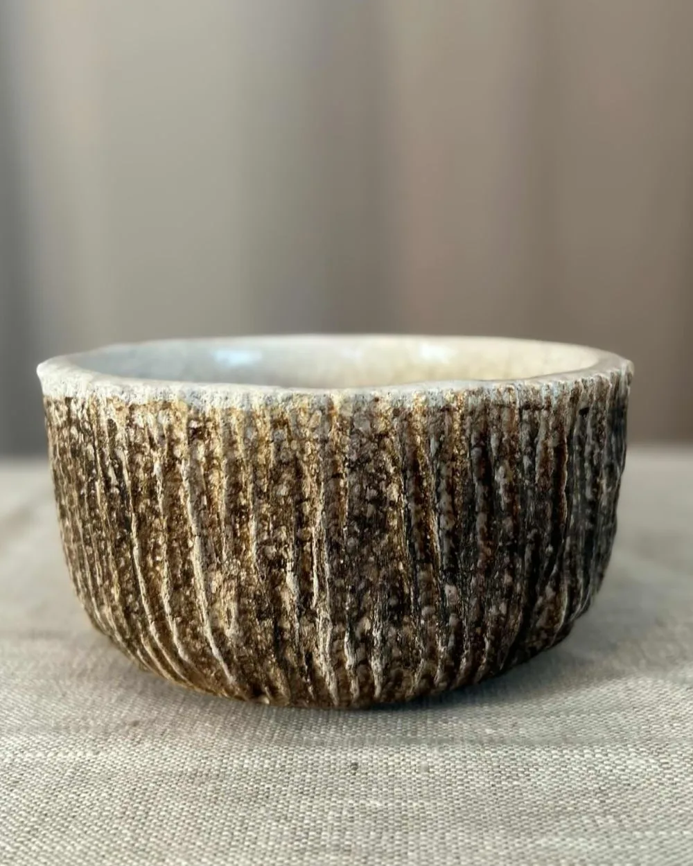 Modelé en grès chamotté, ce bol présente une texture verticale proche d’une écorce ; des sillons sont creusés à l’aide d’outils lors des différents stades de séchage. L’extérieur reste volontairement brut et sombre, tandis que l’intérieur reçoit un émail transparent qui apporte de la brillance et laisse apparaître des craquelures, donnant un effet de nervures. Le contraste entre la surface rugueuse et la douceur de l’émail sublime votre décoration intérieure d’une touche végétale et organique.