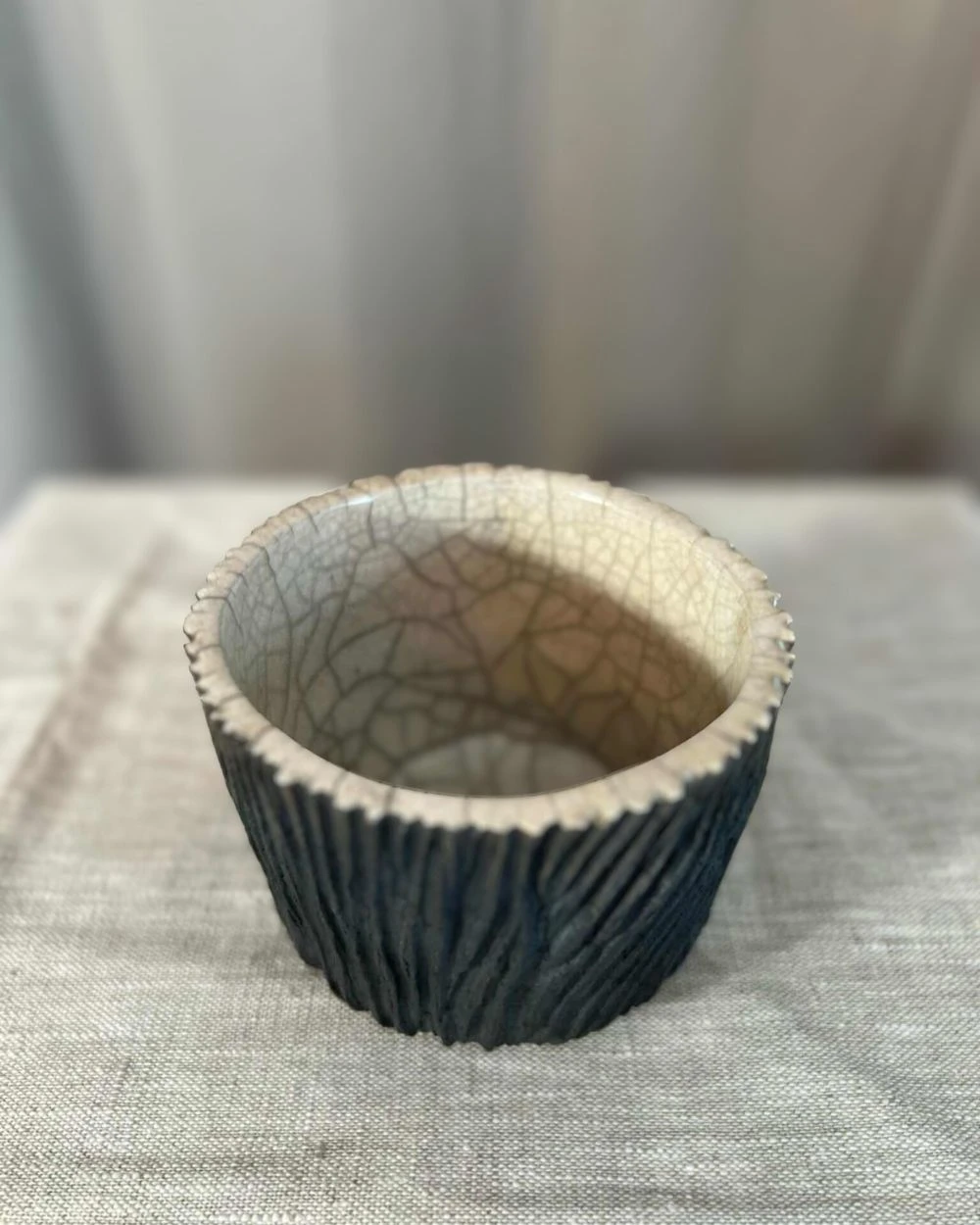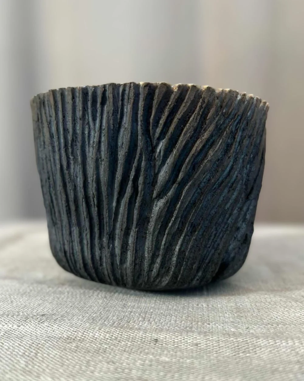 Modelé en grès chamotté, ce bol présente une texture verticale proche d’une écorce ; des sillons sont creusés à l’aide d’outils lors des différents stades de séchage. L’extérieur reste volontairement brut et sombre, tandis que l’intérieur reçoit un émail transparent qui apporte de la brillance et laisse apparaître des craquelures, donnant un effet de nervures. Le contraste entre la surface rugueuse et la douceur de l’émail sublime votre décoration intérieure d’une touche végétale et organique.